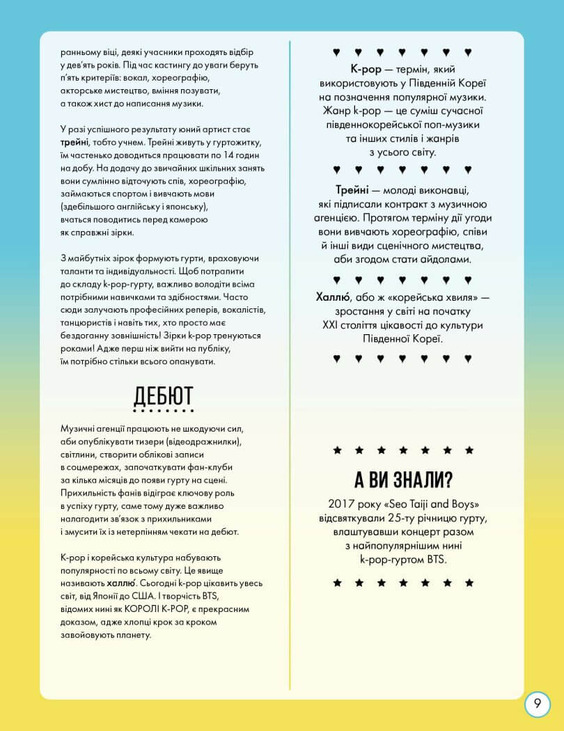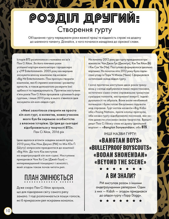 Вокал, хореографія, шалений мікс стилів (поп, хіп-хоп, R&B) — усе це робить BTS впізнаваними й неповторними. Дізнайся більше про кожного учасника гурту, його фірмовий стиль, уподобання та звички. Відкрий усі подробиці успішної музичної кар’єри Королів K-POP — від дебюту до світової слави — і наприкінці книжки пройди тест справжнього фаната BTS.