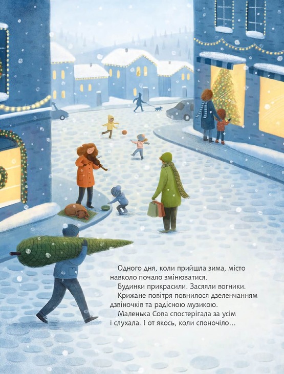 У маленькому містечку високо серед гілля дуже великого дерева жила маленька сова. Одного дня усе навколо раптом замерехтіло і засяяло. Наближалося Різдво… Коли ж пташка повернулася до своєї домівки, то побачила, що ту забрали люди. Вони стверджували, що з цього дерева вийде гарна різдвяна ялинка. Тепер маленька пташка уже не була впевнена, що хоче мати щось спільне з Різдвом…