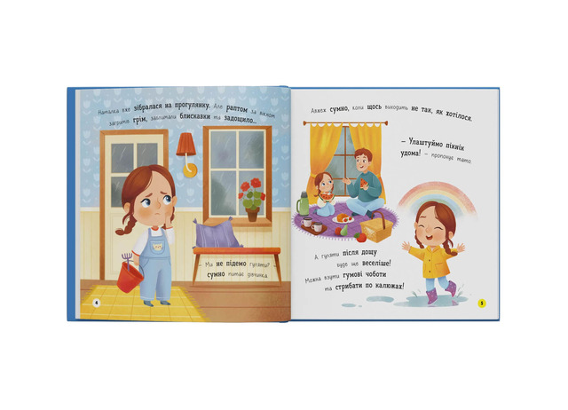 На кожному розвороті дитина познайомиться з новим персонажем і ситуацією, яка викликає сум: зламалася іграшка, дощ змив малюнок, закінчилося свято чи мама була зайнята молодшим братиком. Малюк побачить, що сум — це природна емоція, яку відчуває кожна дитина. І можна навчитися долати його та знаходити нові приводи для радості.