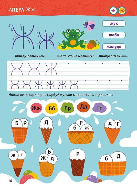 Завдяки цій яскравій збірці завдань дитина не лише вивчатиме літери, а й одразу ж застосовуватиме набуті знання: вчитиметься писати літери, складатиме їх у склади і, зрештою, прочитає свої перші слова. Вправи в книжці розміщені в порядку ускладнення, тож крок за кроком дошколярик засвоїть увесь необхідний матеріал.