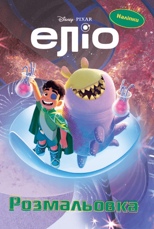 Еліо вирушає у космічну подорож і знаходить нових друзів. Розфарбуй його дивовижні пригоди та доповни зображення наліпками.