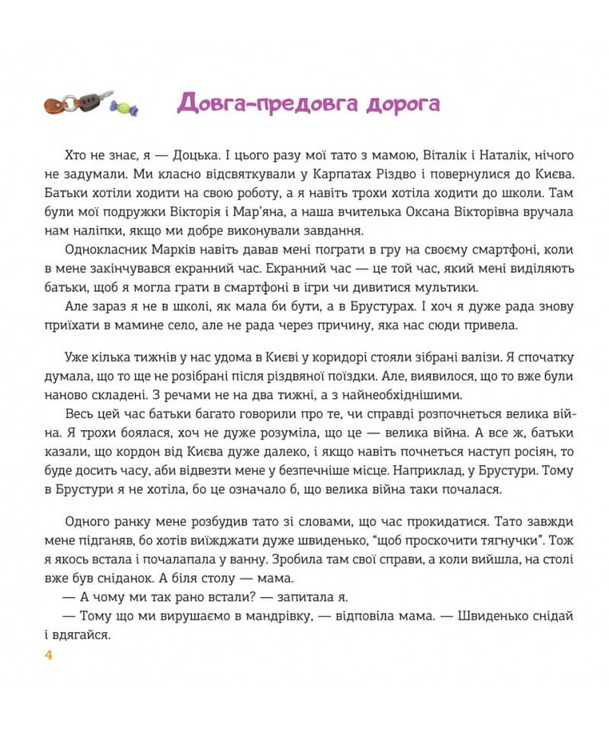 Ви ж уже знайомі з Доцькою – дівчинкою з Києва, і чули про її різдвяні пригоди на Гуцульщині? Про це вона розповіла у книжці «Незвичайне Різдво в Карпатах». Що ж: незадовго після цього Доцька з батьками знову їде на Гуцульщину. Але привід поїздки аж ніяк не святковий – війна…